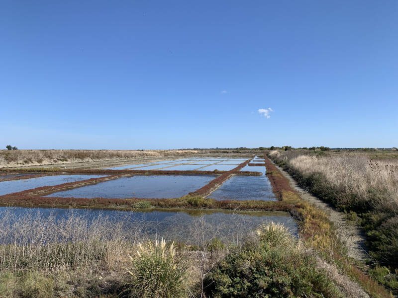 We maken vandaag een bescheiden fietsrondje over het eiland. (Voor de spoorzoekers: Sainte-Marie > Le Bois-Plage > La Couarde-sur-Mer > noordkust > Saint-Martin > La Flotte > Sainte-Marie; ongeveer 23 km.) Overal treffen we prima fietsroutes. En bovenal: het weer is uitstekend. Onderweg zie je regelmatig twee belangrijke “kostwinningen”: wijnbouw en zoutwinning.