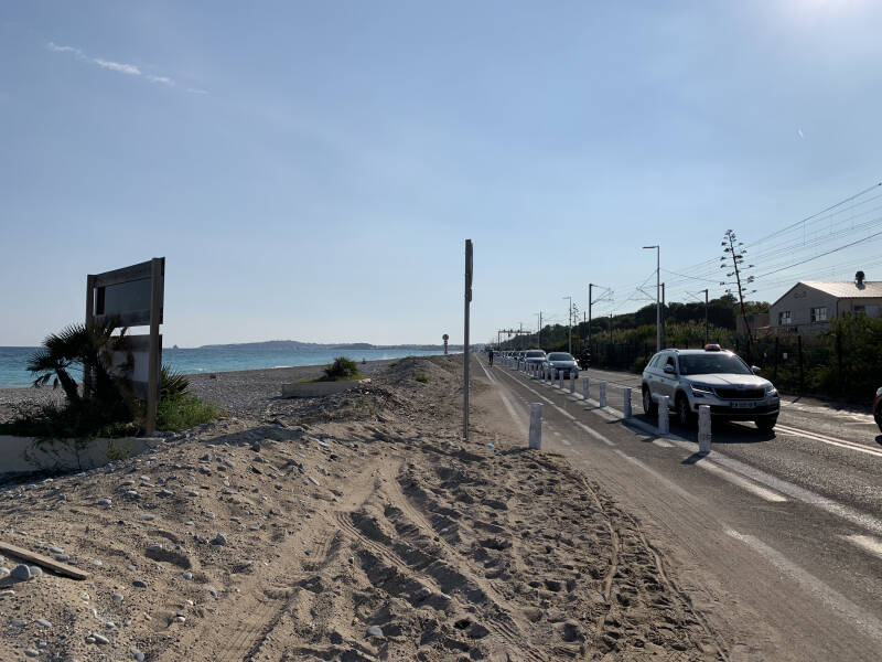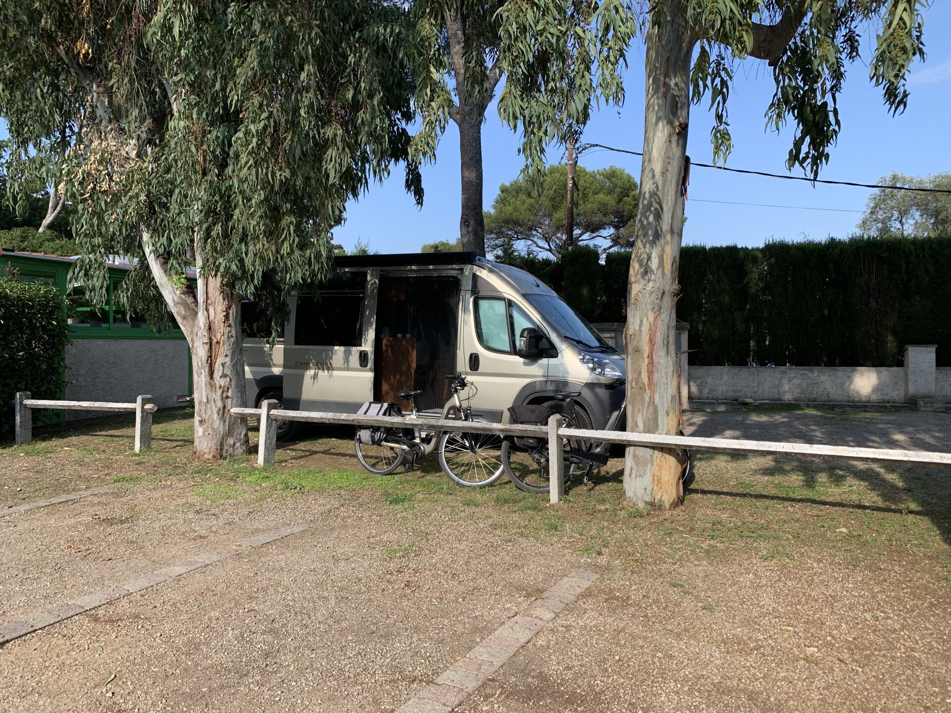 We rijden via Saint-Tropez en Port-Grimaud (bekend van de vakantie van 2001) naar Frejus. Daar kiezen we voor het voortdurende geslinger op de kustweg bij het Esterel-gebergte richting Cannes. In Villeneuve-Loubet, tussen Cannes en Cagnes-sur-Mer, rijden we naar de enige acceptabele camping in deze streek. Daar krijgen we een boodschap die we nog nooit hadden gehoord: ”uw camper is te lang voor de plaatsen die nog vrij zijn op onze camping”. Nu is onze buzz incl. fietsendrager net iets langer dan 7 meter, dat is vrij bescheiden, maar met uitgedraaide fietsendrager (nodig om de achterdeuren te kunnen openen) wordt dat bijna 8,5 meter, en dat is blijkbaar te lang. Wij worden verwezen naar een parkeerterreintje bij de ingang, waar we, met stroom, 2 dagen mogen staan. Achteraf gezien helemaal niet zo erg, want we staan op de enige horizontale plek van de hele camping.