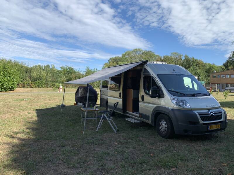 Tijdens de rit door de Vogezen is het overwegend bewolkt. In Altkirch is het nog maar lichtbewolkt met een temperatuur van 27° C. We draaien de luifel dus maar uit, en gaan lekker buiten zitten.