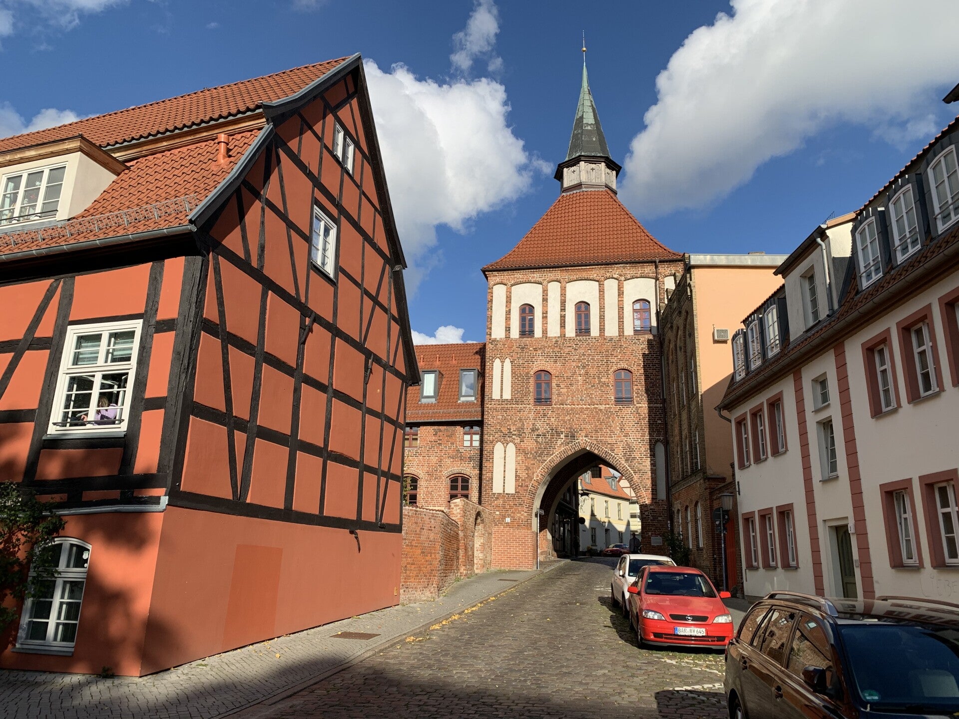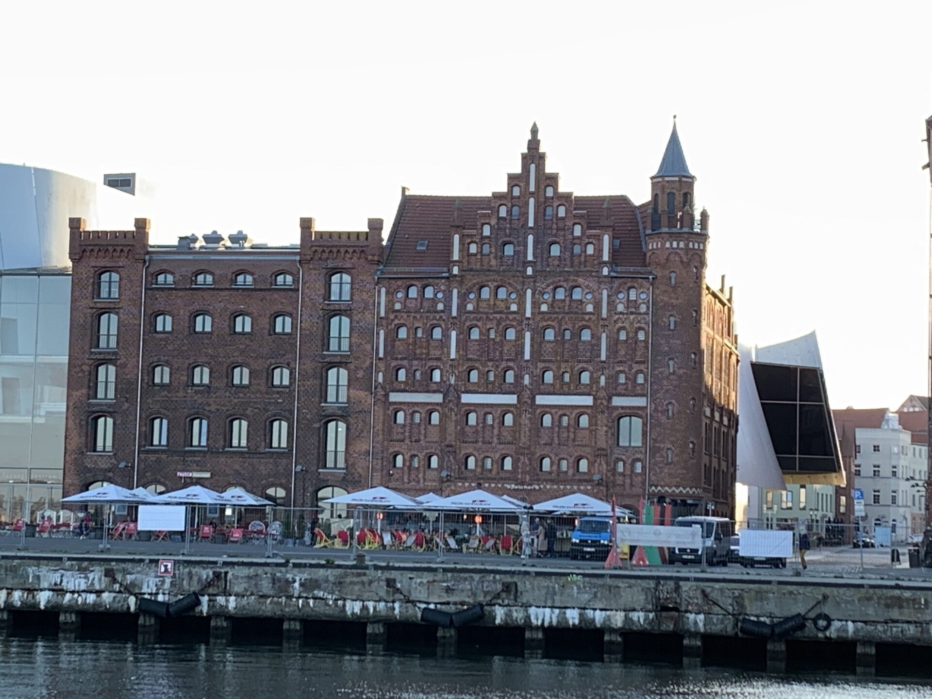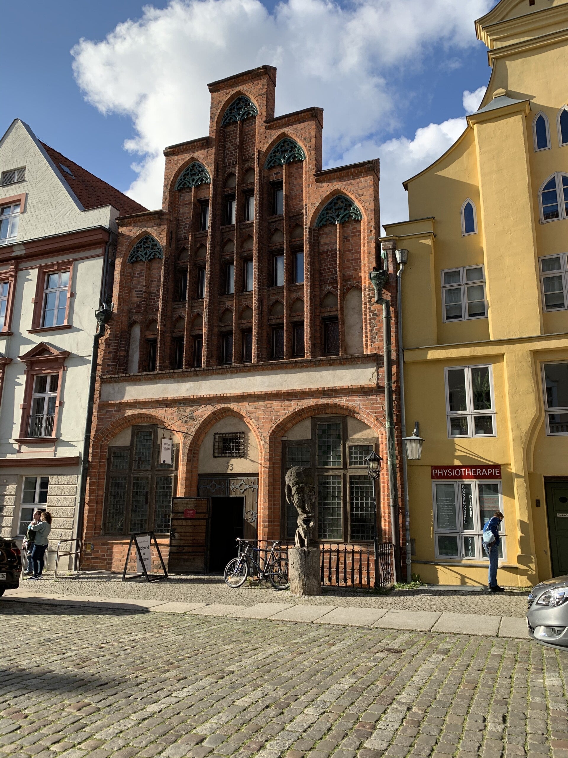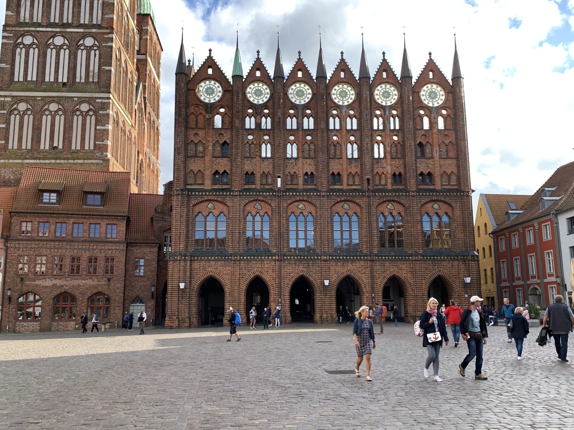 We fietsen in de loop van de middag naar de stad. Stralsund is een van de oudste hanzesteden van Duitsland en dat is in het centrum op verschillende plaatsen goed te zien. Kenmerkend is de baksteengotiek. Omdat er in deze streek helemaal geen natuursteen voorhanden was, zijn sinds eeuwen alle gebouwen van baksteen gemaakt. De bekendste voorbeelden zijn het stadhuis van Stralsund en de Nikolaikirche, een hallenkerk uit 1270, met de voor de baksteengotiek zo kenmerkende witgepleisterde vlakvullingen. Ook verschillende woonhuizen zijn opgetrokken uit baksteen.