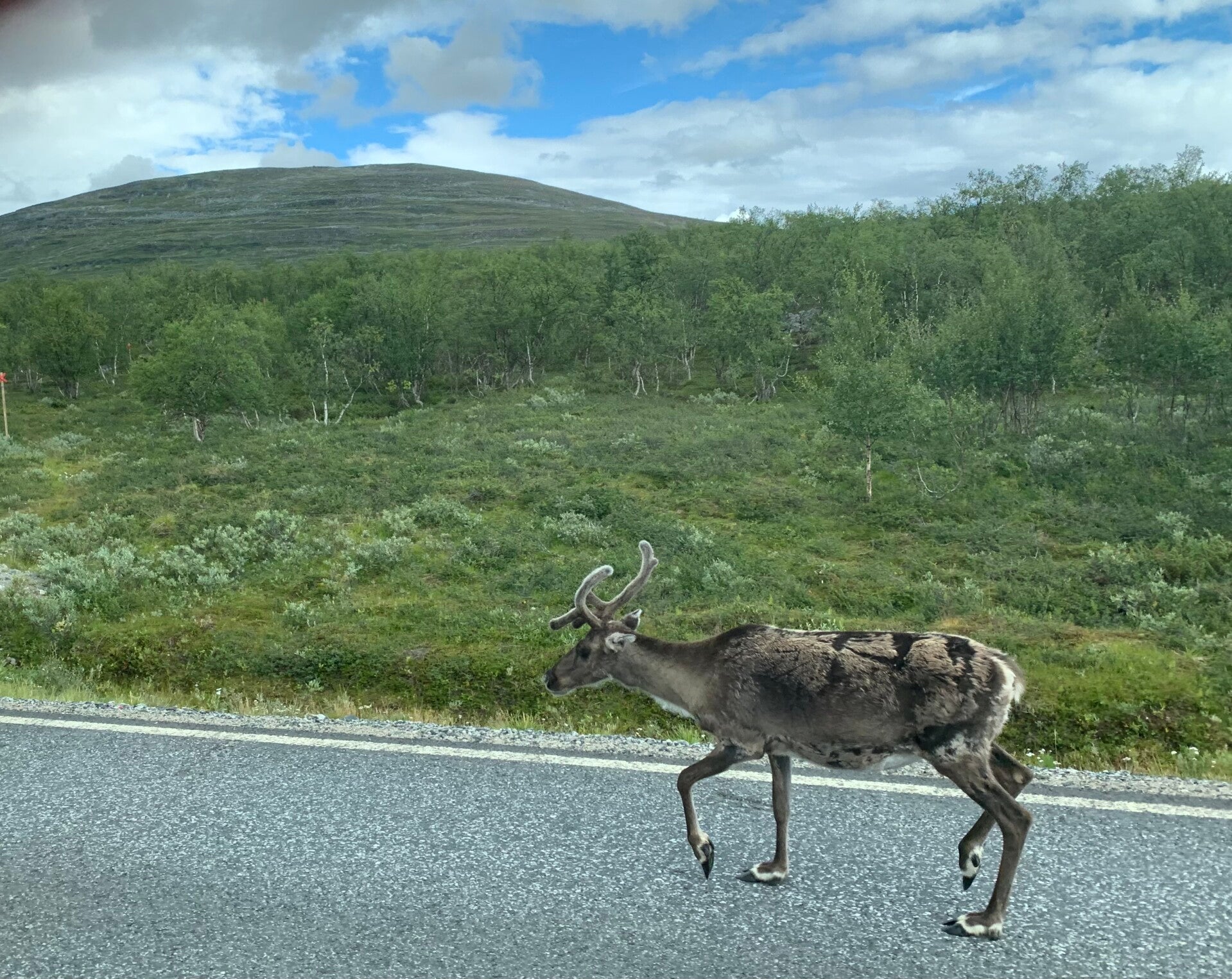 Vandaag hebben we een Lapland-reisdag. Vanuit Kiruna rijden we nog een stukje op de E10 richting Luleå. In Svappavaara slaan we linksaf, de E45 op (deze weg zullen we op de terugreis nog vaker volgen). Bij Karesuando (Zweeds Saami) en Kaaresuvanto (Fins Saami), rijden we Finland binnen. We slaan hier linksaf, de E8 op (deze weg gaat naar Tromsø). Even voorbij Kilpisjärvi rijden we Noorwegen binnen. Vlak voor Skibotn komen we de E6 weer tegen.