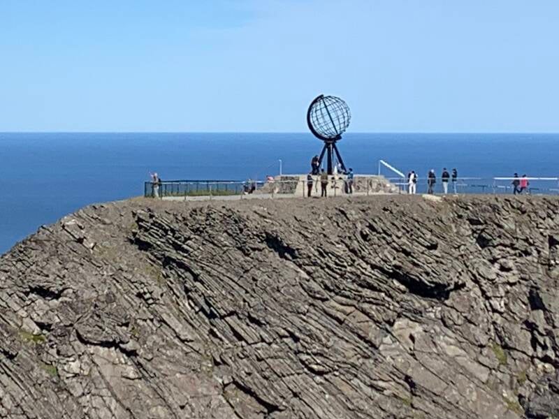 Om 13:15 rijden we, na 243 km rijden en een ruime koffiepauze, weer het parkeerterrein van de Noordkaap op. Het is hier lekker zonnig, met wat wolkenflarden, vrij winderig, 17°C. We wisten niet, dat de Barentszzee zó blauw kon zijn. Wat een verschil met 2018, toen je, met enige overdrijving, nauwelijks een hand voor ogen kon zien.