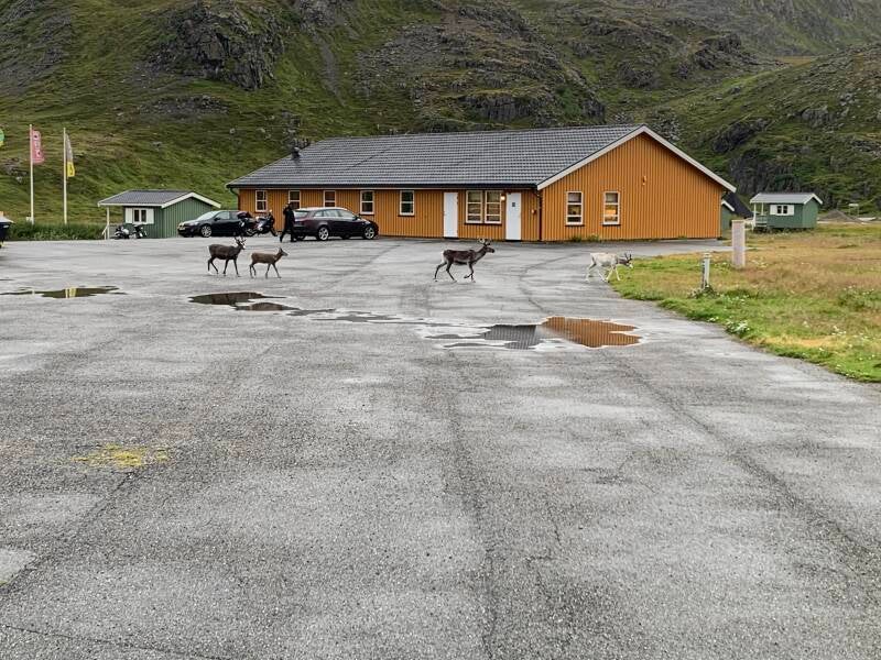 Er staan twee tentjes van fietsers. Verder hebben we het rijk alleen, althans, dat lijkt aanvankelijk zo. Al snel blijkt echter, dat de camperplaats in een trekroute voor de plaatselijke rendieren ligt. Om de haverklap komt er een groepje voorbijgelopen. We vervelen ons tijdens deze rust(mid)dag dus geen moment.