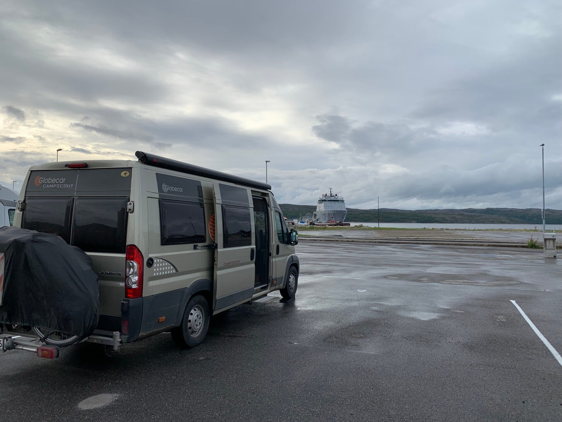 We staan nu op een prima camperplaats in Kirkenes. Min of meer direct tegenover ons is de aanlegsteiger van de Hurtigruten. Dagelijks loopt deze om 09:00 uur binnen.