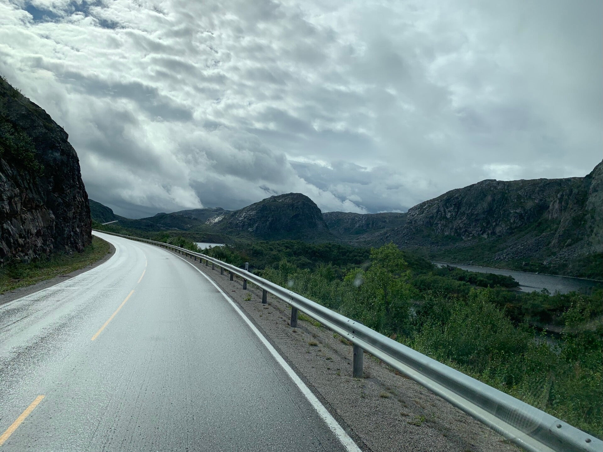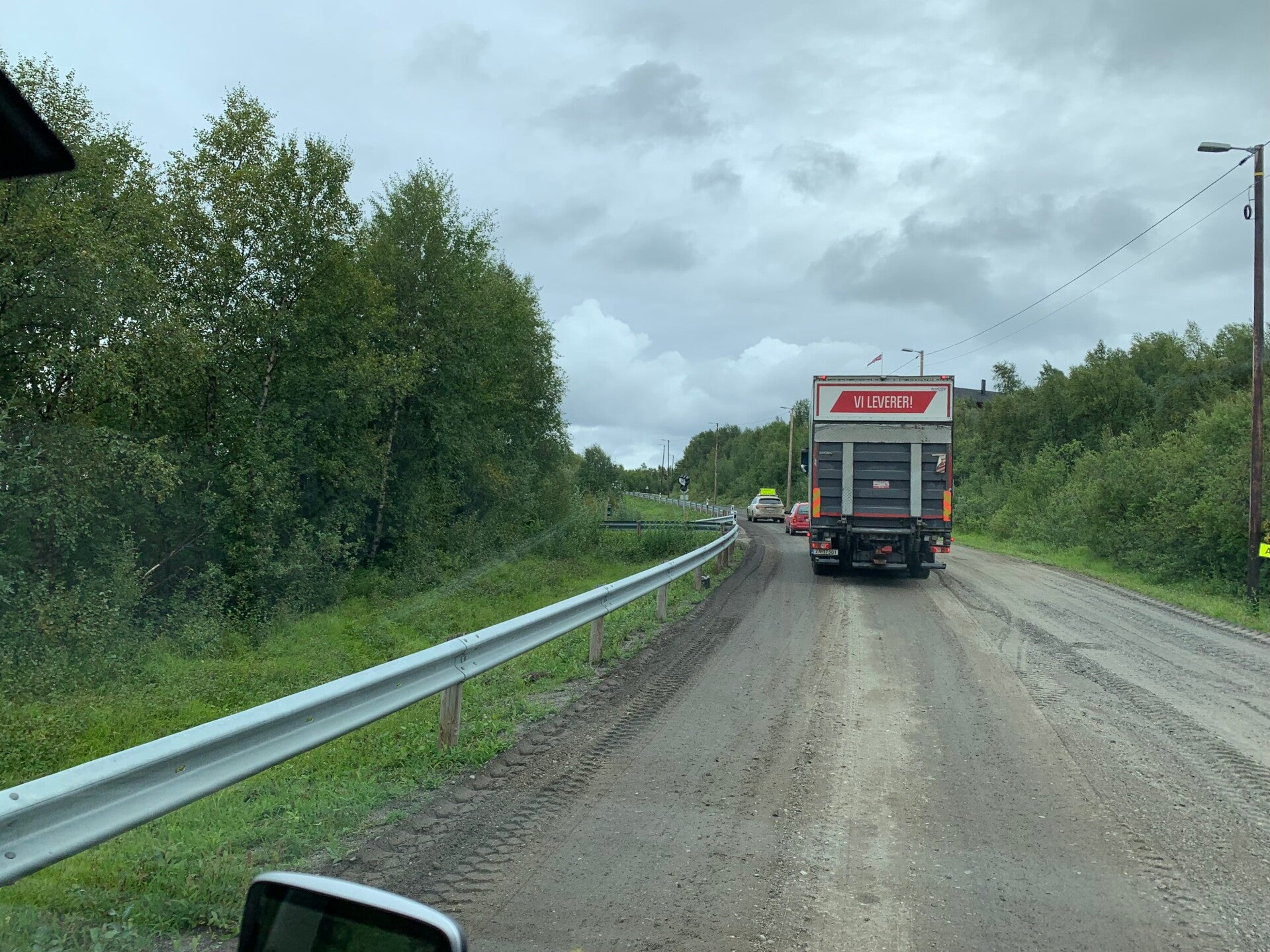 Vanaf Tana bru gaan we vanochtend verder op de E6. Het landschap is boeiend. Stenig gebied wordt afgewisseld met toendra-achtig gebied. Bij het plaatsje Neiden (kijk maar op de plattegrond) stuiten we op een lang traject waar de verharding volledig is gefreesd. Onder aanvoering van een verkeersregelaar rijden we in colonne over de resterende steenslag.