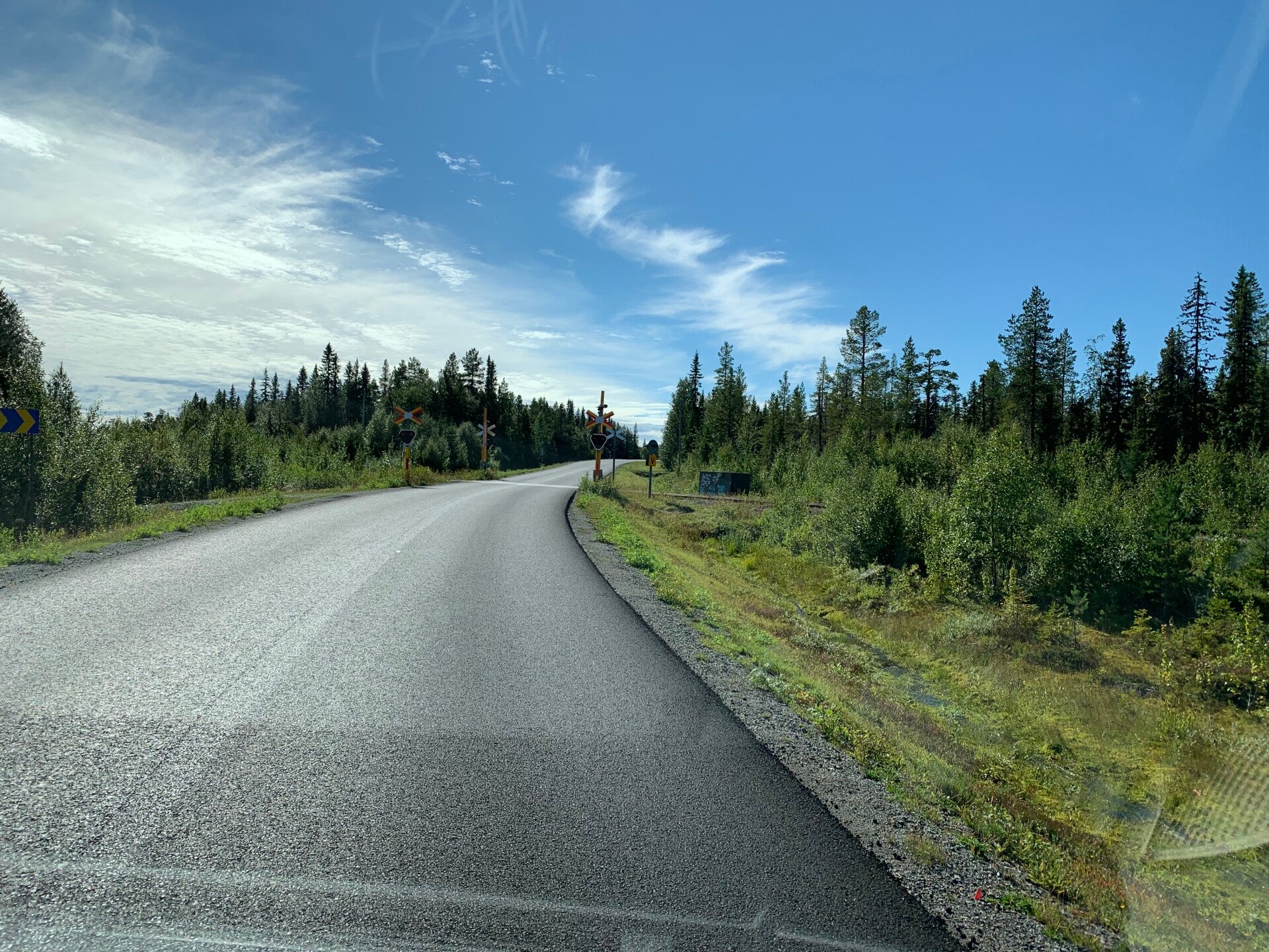 Onderweg zien we heel veel bomen. Voor de verandering zijn dat niet allemaal groene bomen. Regelmatig komen we de overwegbomen van de Inlandsbanan tegen. Dat is een spoorlijn, overwegend toeristisch, tussen Mora en Gällivare. Deze rijdt alleen in de zomermaanden: een maal per dag noordwaarts en een maal per dag zuidwaarts. Onderweg zien we tot onze verbazing in de verte een korte rood-witte trein (een "tweetje") door het terrein rijden. De foto's van deze trein zijn helaas mislukt.
