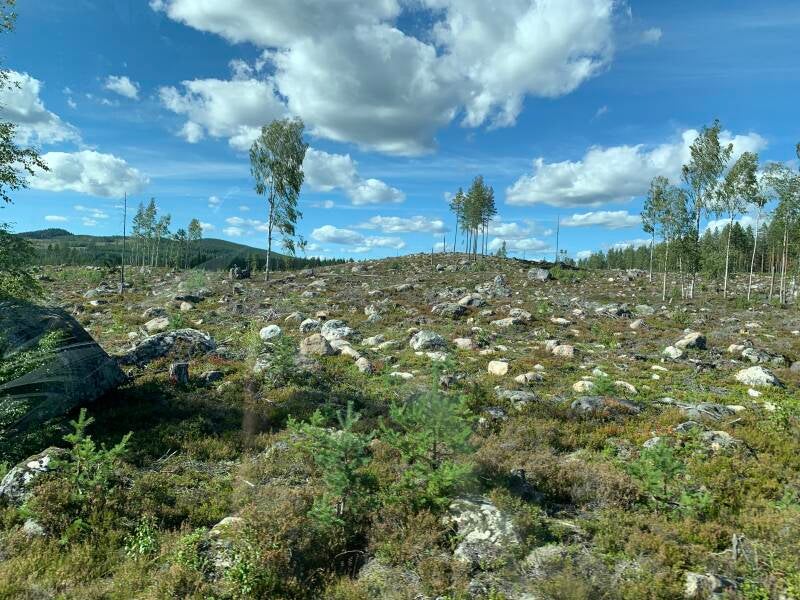 We rijden niet de hele dag over de E45. TomTom adviseert een binnenboortje om de knik via Sveg te vermijden. Vrij veel van onze voorliggers lijken ook voor deze alternatieve route te kiezen, dus wij sluiten ons bij hen aan en slaan linksaf de "296" op, naar Kårböle. Bij deze plaats rijden al die voorliggers echter rechtdoor naar de kust, naar Hudiksvall, terwijl TomTom rechtsaf wil, via de "296" naar Loos. We komen nauwelijks ander verkeer tegen, waardoor je je op een gegeven moment gaat afvragen, of je wel op de juiste weg zit. De route is landschappelijk wel interessant, vooral het deel net achter Loos. Dat voert door een nogal opvallend stenig landschap. Dat is weer eens wat anders dan al die bomen.