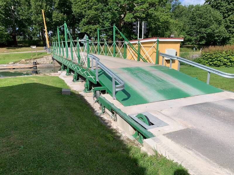 We zien onderweg 2 boten en twee maal 6 bruggetjes. Die bruggetjes zijn bijzonder, want ze worden niet gehesen of gedraaid, maar “opengerold”. In gesloten toestand (gesloten voor varend verkeer) ligt het brugdek voor iets meer dan 50% op een van de oevers, op wielen. Moet de brug worden geopend, dan rollen de wielen de hele brug op het droge.