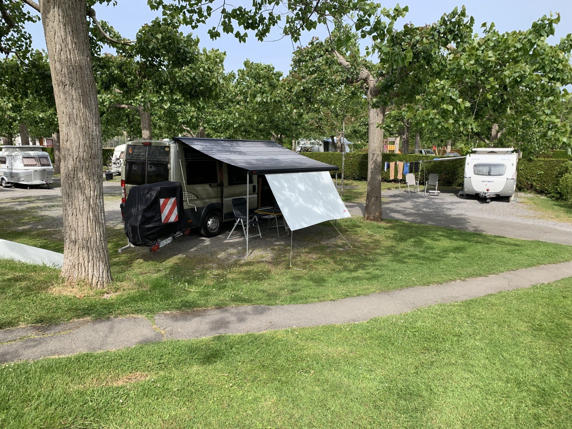 (We hebben dat ding aangeschaft na onze reis door Andalusië. Het gebeurde daar nog wel eens dat we zelfs onder de luifel niet in de schaduw konden zitten. De zonblokker ligt al twee jaar achter in de laadruimte, want in Scandinavië hadden we dat ding niet nodig. We verwachten dat ie tijdens deze reis geregeld dienst zal doen. Daarom hebben we ‘m vandaag maar eens uitgeprobeerd.)
