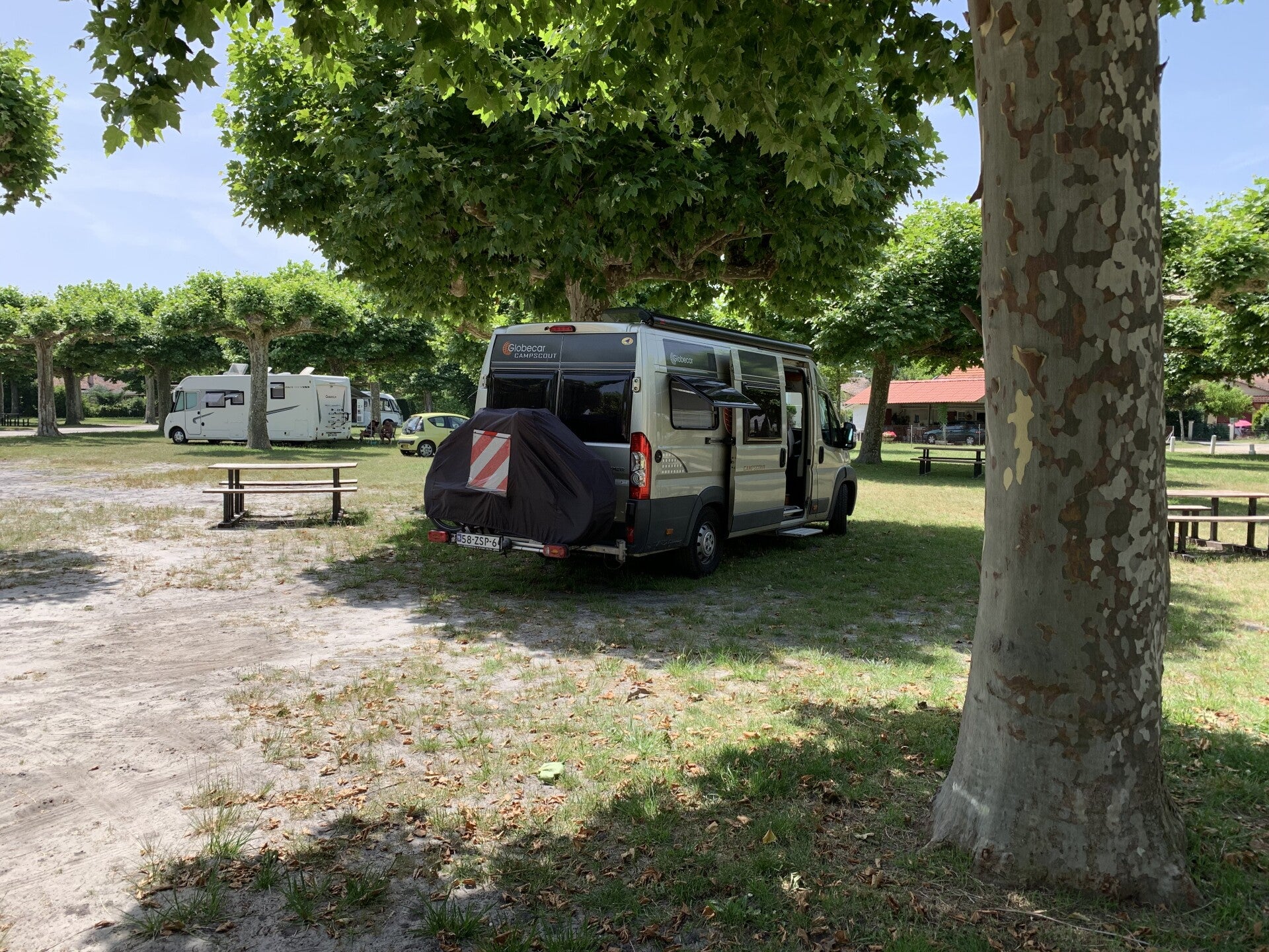 Het is ons gelukt om er 8 uur over te doen: we vertrekken in Urrugne om 10:30 en komen in Douville aan om 18:30. Dat is gelukt door een lange break te houden bij de Mac in Mont de Marsan (prima airco en dito internet), en door een siësta te houden in Houeillès, op een camperplaats met heel veel knot-platanen, dus met heel veel schaduw. Houeillès is overigens de plaats waar we op de heenreis (op de 3e dag) achter een catamaran kwamen te zitten. We denken, dat de producent van die catamaran hier ergens langs de route is gevestigd, want we zien onderweg naar Houeillès op een groot parkeerterrein precies zo'n kanjer van een catamaran als op de heenreis.