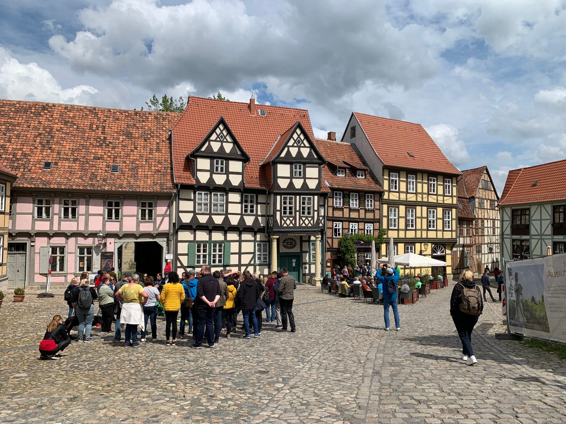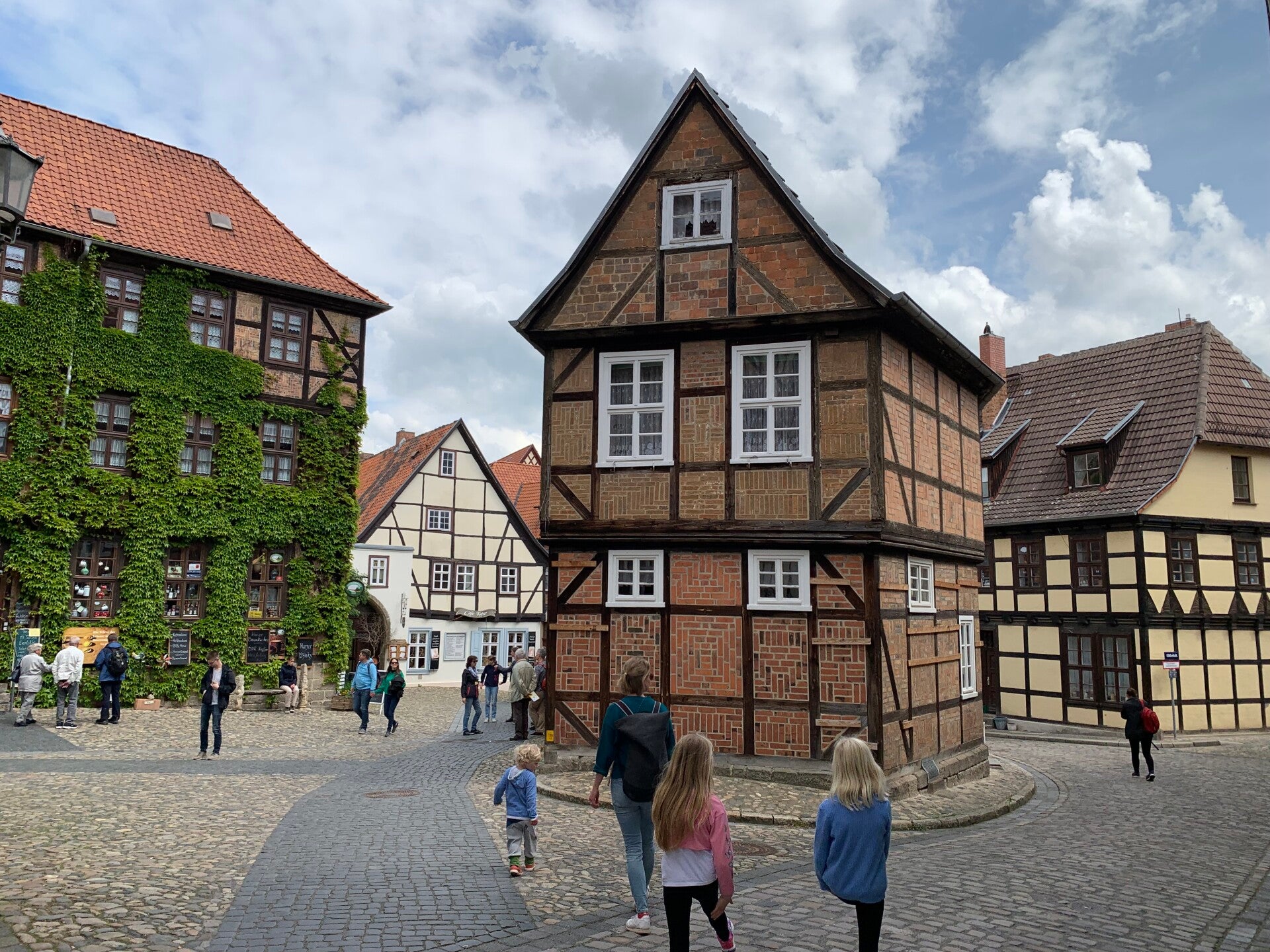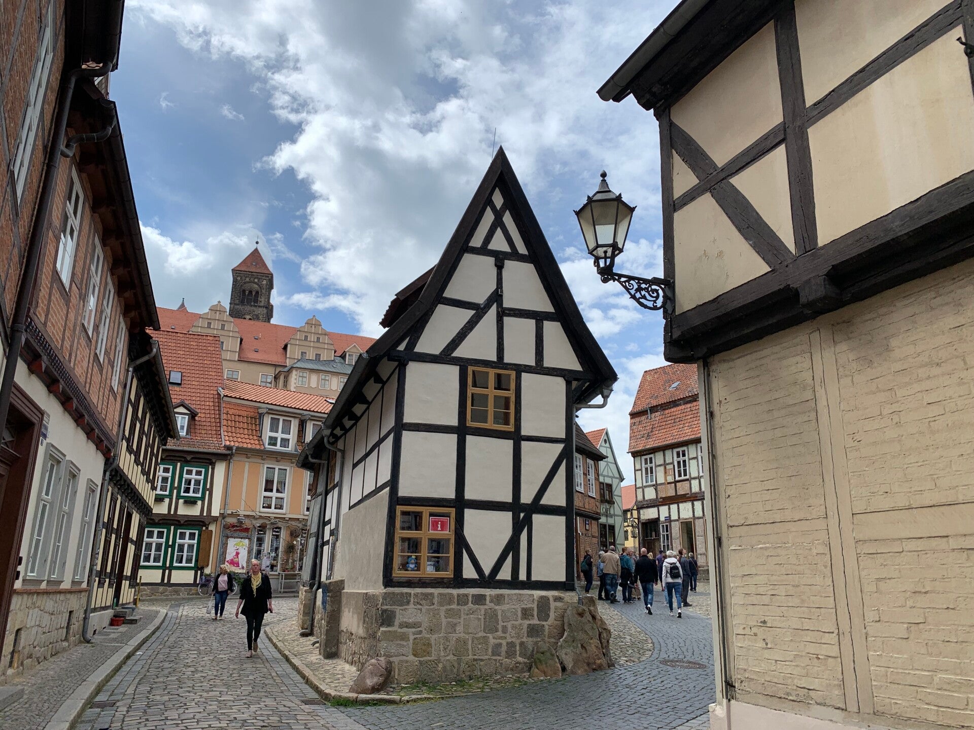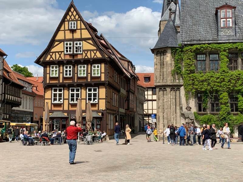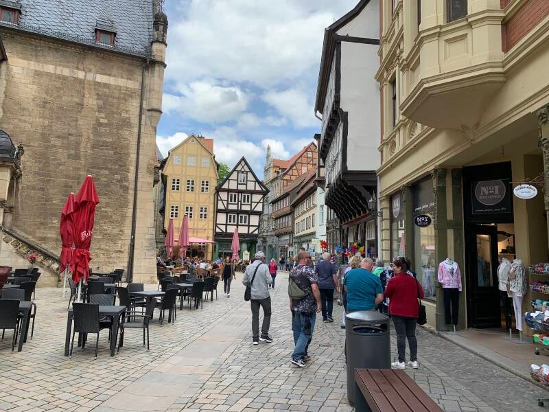 Elke vergelijking gaat wel ergens mank, maar als we de vakwerkstadjes Fritzlar, Goslar en Quedlinburg dan toch met elkaar moeten vergelijken, dan steekt Quedlinburg er met kop en schouders bovenuit. Dat zal wellicht mede liggen aan de gezellige drukte in het stadje (Hemelvaartvakantie), maar los daarvan, de Altstadt kent geen enkele dissonant. Overal, zowel in de kronkelige straatjes met kinderkopjes als op de pleintjes en pleinen (waaronder de Markt), zowel beneden als op de Schloßberg, overal proeft men de middeleeuwen. Quedlinburg verdient dan ook met recht het predikaat “Unesco werelderfgoed”.