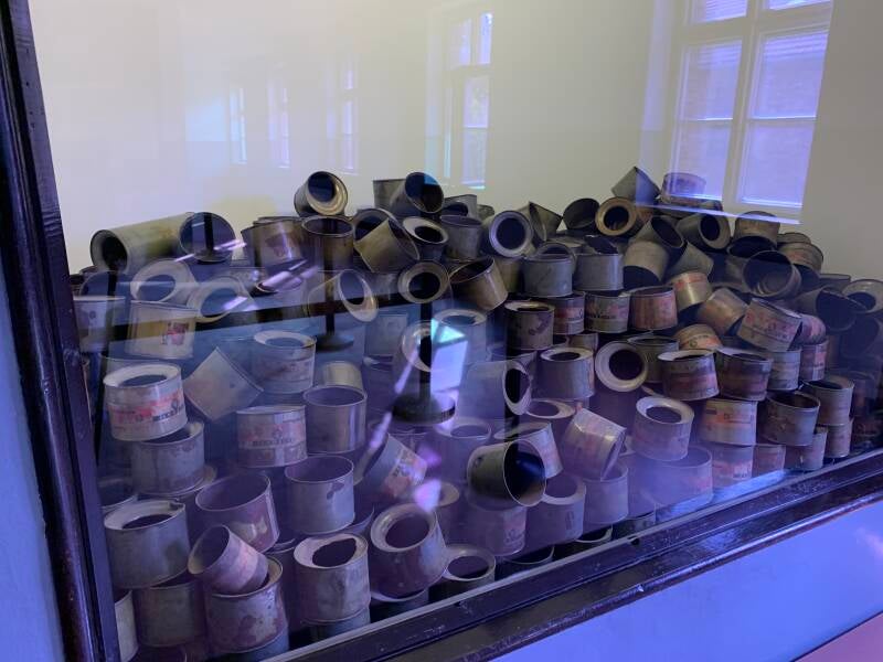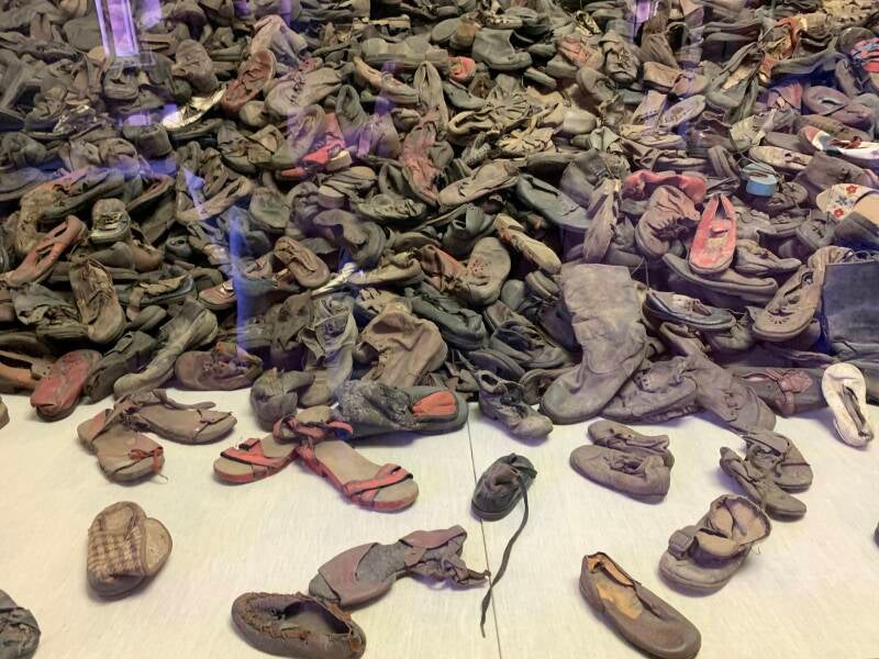 Eenmaal door de poort met “Arbeit macht Frei”, bekijken we verschillende gebouwen van binnen. Daar wordt een gedetailleerd beeld geschetst van de gang van zaken in het kamp. Grote indruk maakt de expositie over medische experimenten, o.a. door Joseph Mengele. Indrukwekkend is ook de verzameling stille getuigen van de massale wreedheid, met een grote stapel kinderschoentjes als triest hoogtepunt.