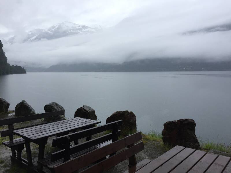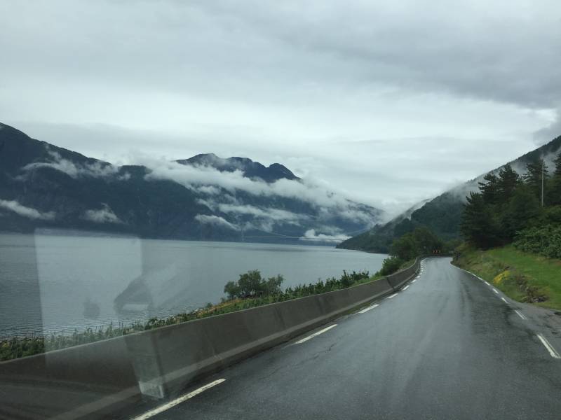 Voorbij Odda volgen we de oever van het Hardangerfjord (met een prima picknickplekje aan het water, althans, bij mooi weer).