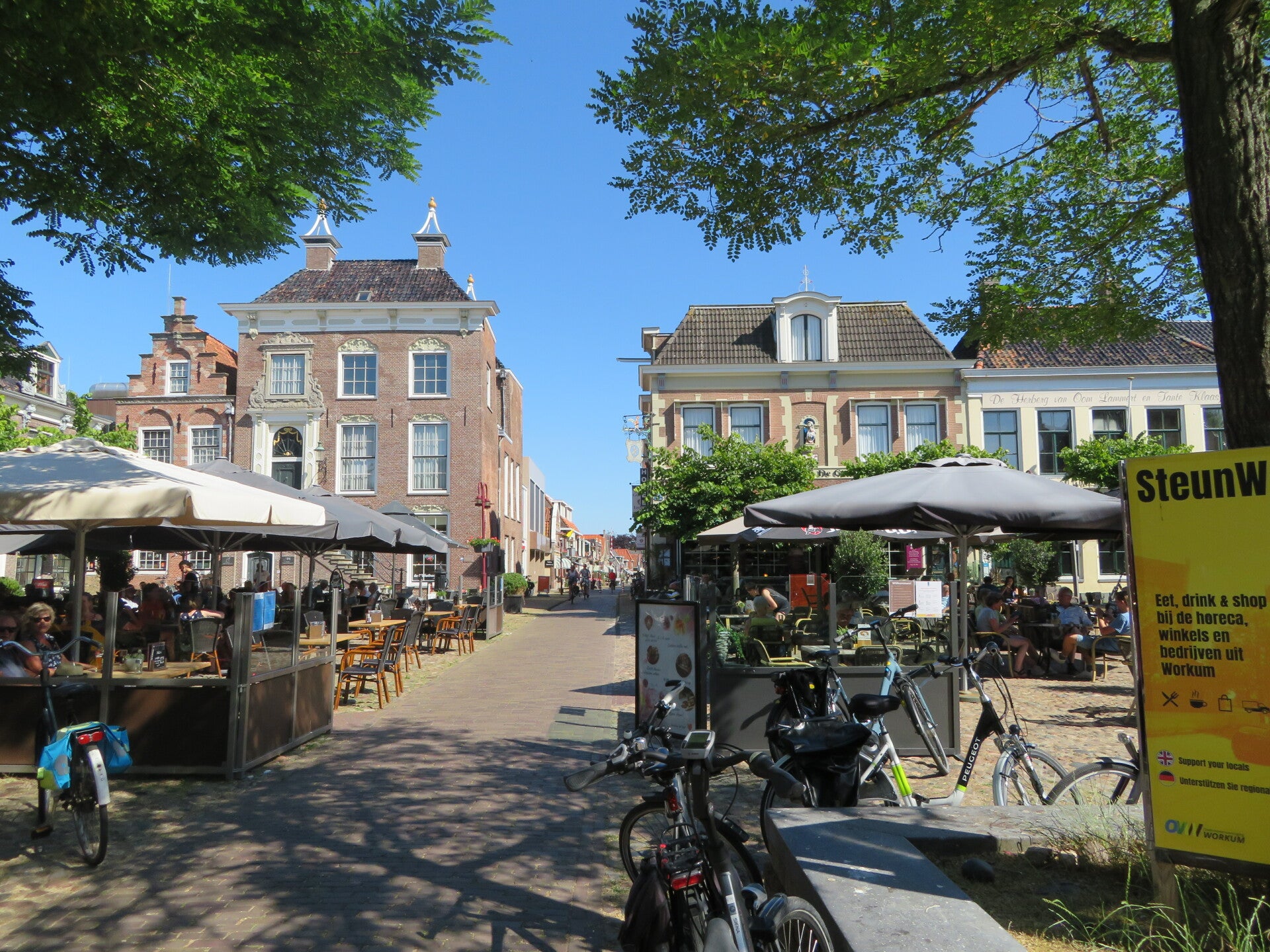 Via een aantal lokale wegen rijden we naar Workum. Dat heeft veel meer een stedelijk karakter, met fraaie oude stadshuizen. Workum heeft ook veel meer voorzieningen. Zo is er een fietsenmaker waar Ted een nieuw spiegeltje kan kopen.