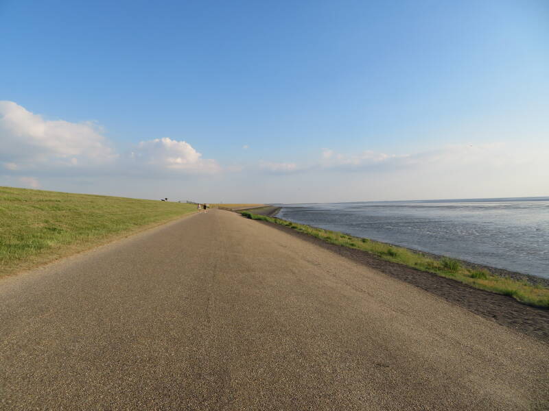 We doorkruisen het hele centrum: Zuiderhaven, Grote Bredeplaats, Voorstraat, Heiligeweg, Lanen, enz.. Via de Noorderhaven en de Waddenpromenade rijden we naar de Westerzeedijk. We fietsen nog zo'n 2 km over die dijk. Die is erg imposant, veel hoger dan de dijk bij Hindeloopen. Maar dit is dan ook open water, de Waddenzee, met mogelijk noordwester stormen, en niet het IJsselmeer.