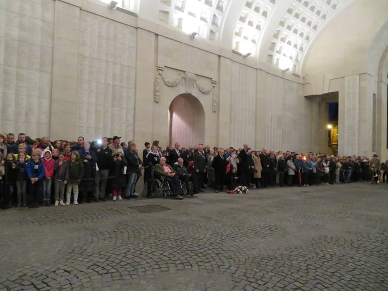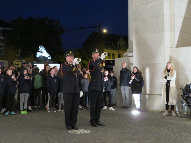 In de loop van de middag is het weer behoorlijk opgeklaard. Daarom fietsen we 's-avonds naar de Menenpoort. Er is vooral veel belangstelling van Britten. Het is er behoorlijk druk. Voor een goede plaats moet je er echt uiterlijk om 19:30 zijn. We kunnen niet anders dan stellen, dat het een indrukwekkende plechtigheid is.