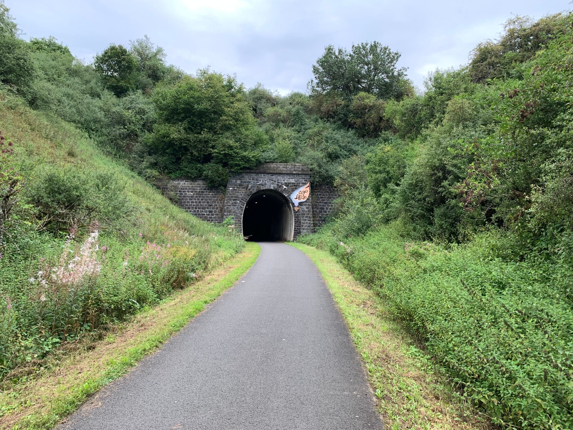 Vandaag fietsen we de andere richting uit: naar Daun. Al meteen bij de camperplaats begint de route te stijgen. Die stijging duurt voort tot bij de tunnel, die kort voor Daun ligt. De temperatuur in deze tunnel verandert in de loop van het jaar nauwelijks. In de zomer is het er behoorlijk fris.