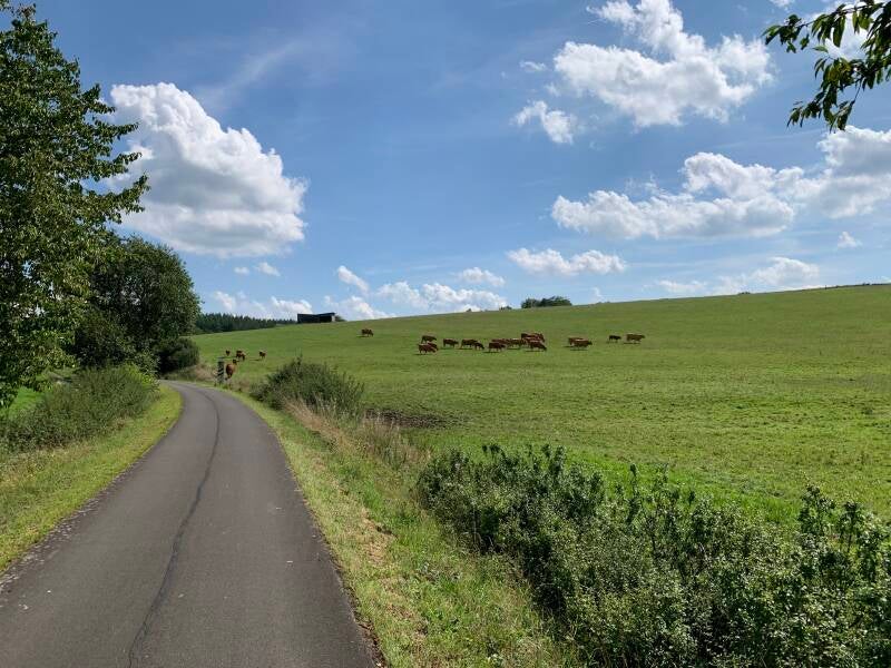 Vanuit de camping kun je in twee richtingen fietsen: richting Daun of richting Moezel. Vandaag gaan we richting Moezel. Ons doel is Witlich, De route gaat door een golvend landschap, met afwisselend bossen en weilanden. Omdat het fietspad op een voormalige spoorlijn ligt, is het stijgingspercentage nergens groter dan 2%.