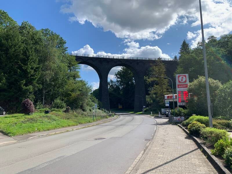 In Bütgenbach rijden we het stadje in voor wat inkopen. We komen in de buurt van het viaduct waar we gisteren nog overheen hebben gereden.