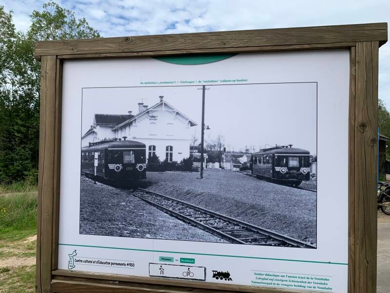 Bij Montenau komen we op de voormalige Vennbahn, een spoorlijn van Aken, via Monschau en St. Vith naar Troisvierges in Luxemburg. We rijden over de Vennbahn naar Waimes (Weismes). Dat was ooit een belangrijk knooppunt, want hier kruiste de Vennbahn met de lijn 45/45A, de Vennquerbahn, de verbinding tussen Trois-Ponts, Malmedy en Stavelot in het westen en het Duitse Jünkerath in het oosten. Het stationsgebouw van Waimes bestaat nog, van de perrons en de sporen resten nog slechts een paar foto’s.